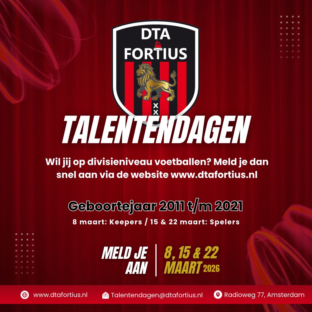 Denk je dat je goed genoeg bent om in te stromen in de jeugdopleiding van DTA Fortius, meld je dan snel aan voor de Talentendagen 2026 via de link hieronder. Als je die dag goed presteert, ontvang je een uitnodiging voor een vervolg!